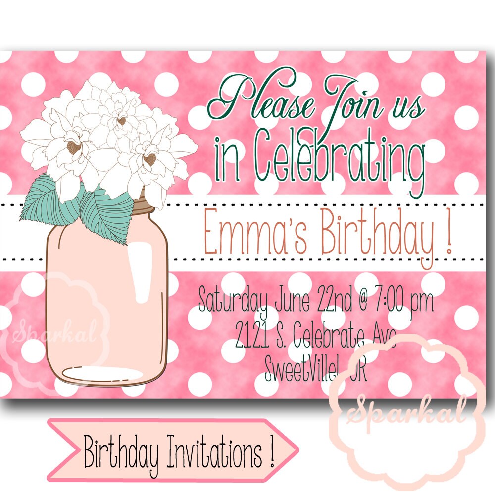 Mason Jar Birthday Party Invitation, Pink Mason Jar Polka Dot Printable, Mason Jar Flowers, Ball Jars with White Flowers