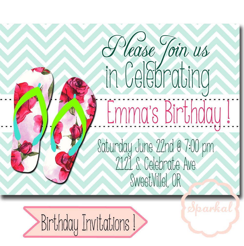 Summer Birthday Party Invitation, Beach Flip Flops Printable, Green Chevron Print Birthday Party, Summer Party with Beach Flip Flops